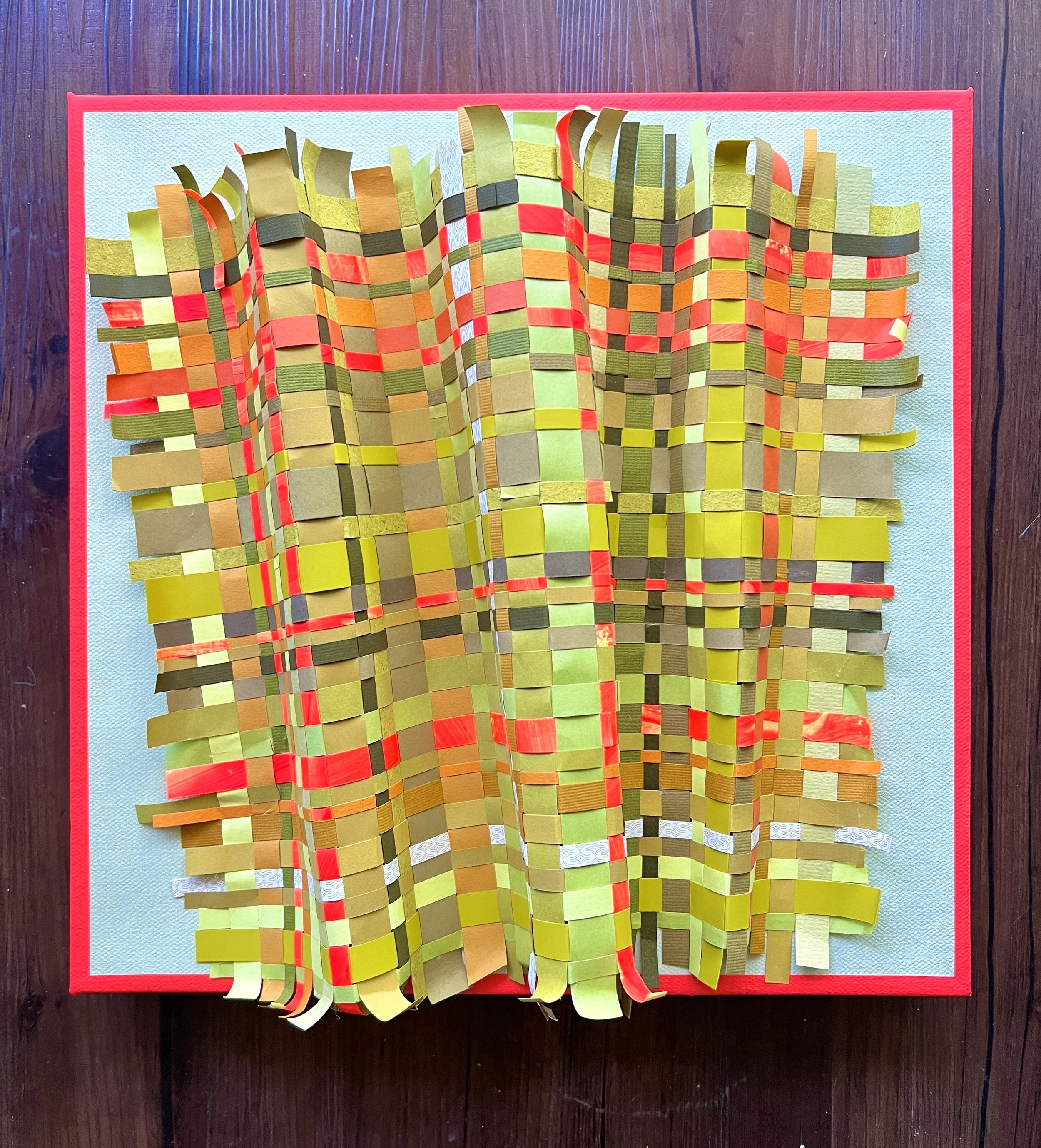 Created from folded paper that’s been glued together and applied to a canvas, these “paintings” are really canvas sculptures.