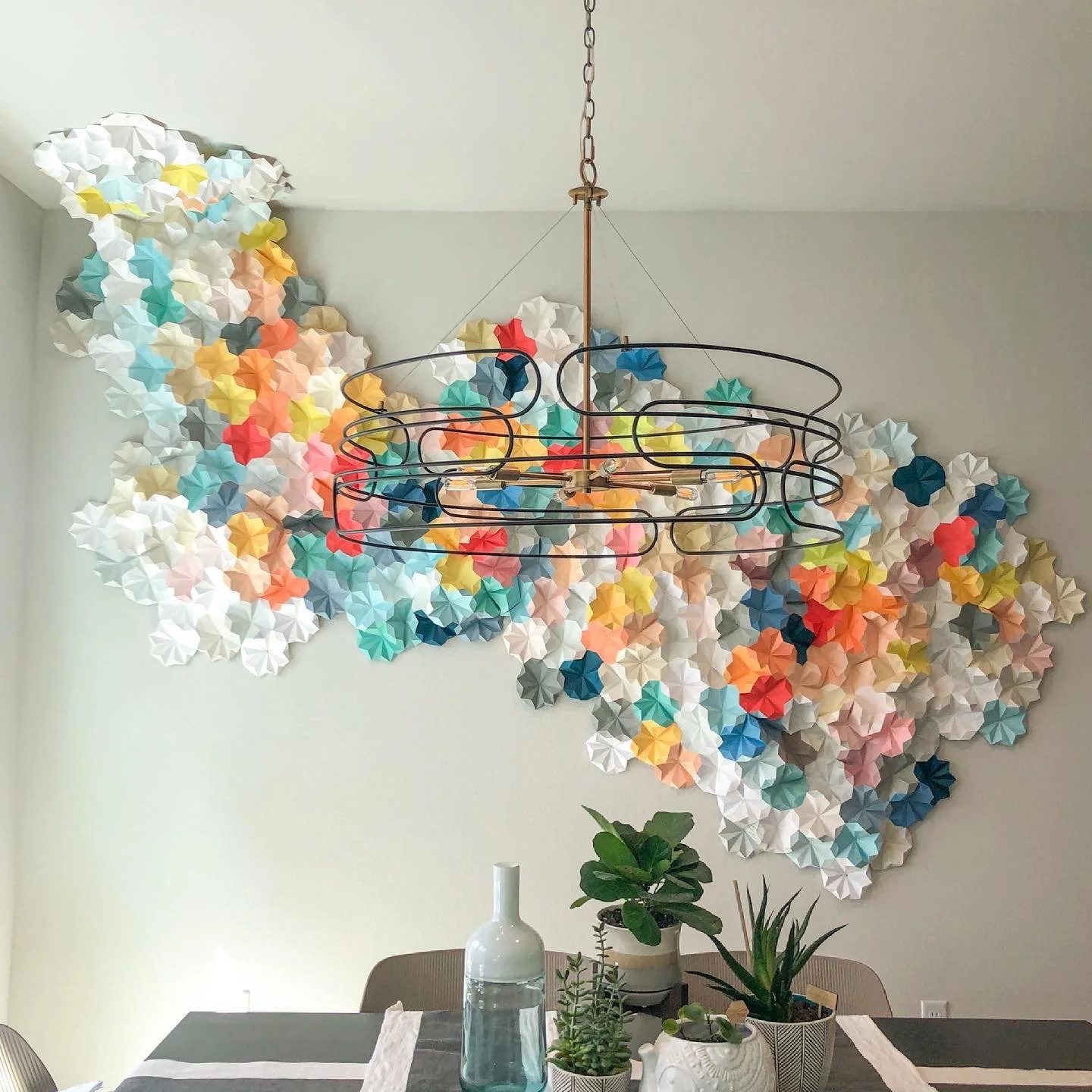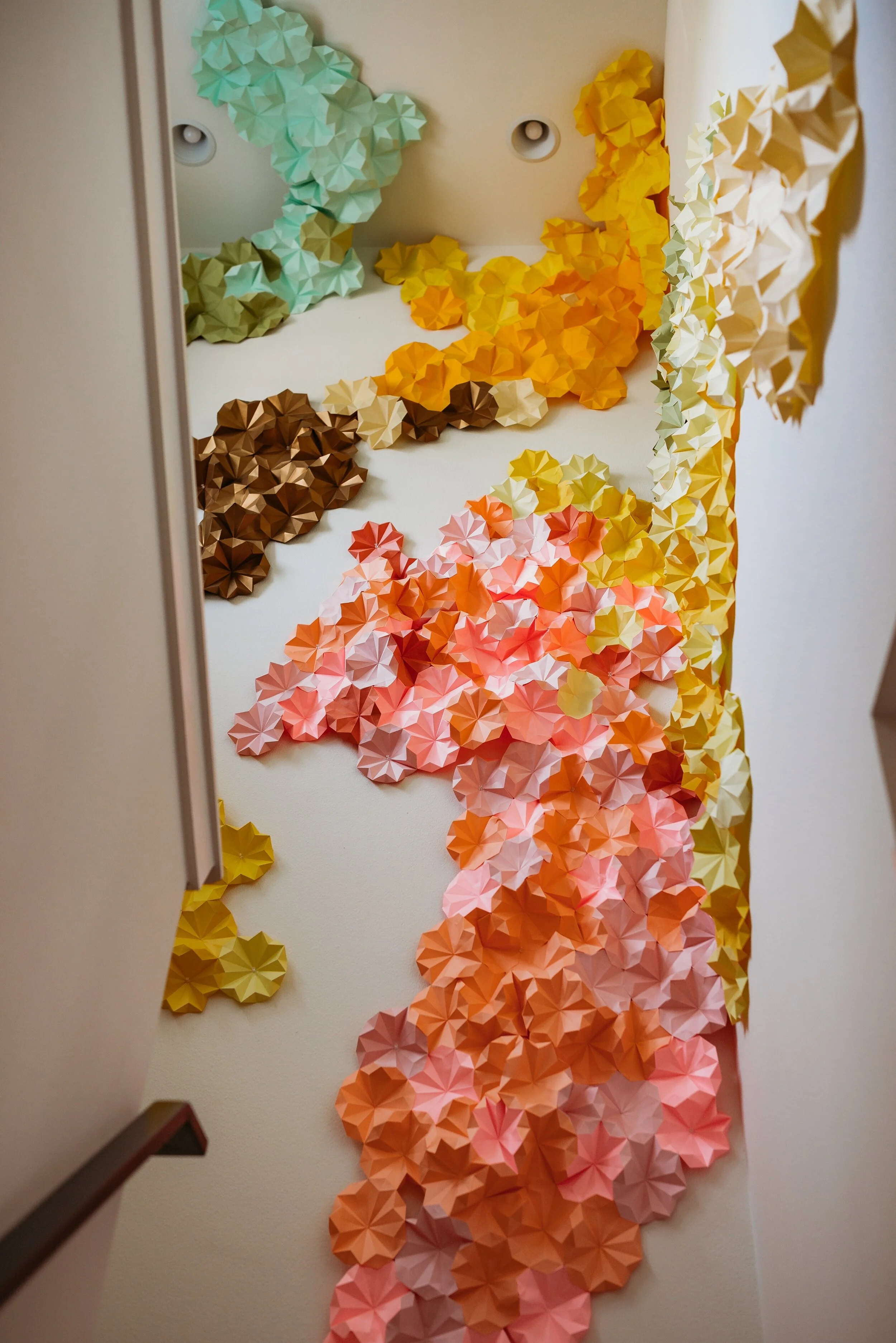 Created from folded paper that’s been glued together and applied to a canvas, these “paintings” are really canvas sculptures. We make new work all the time, and the best way to see what’s currently for sale is through our Instagram. We also have a limited collection of larger pieces that is available in the shop section. Want to choose your own size and colors? OF COURSE we’ll make you a custom piece!